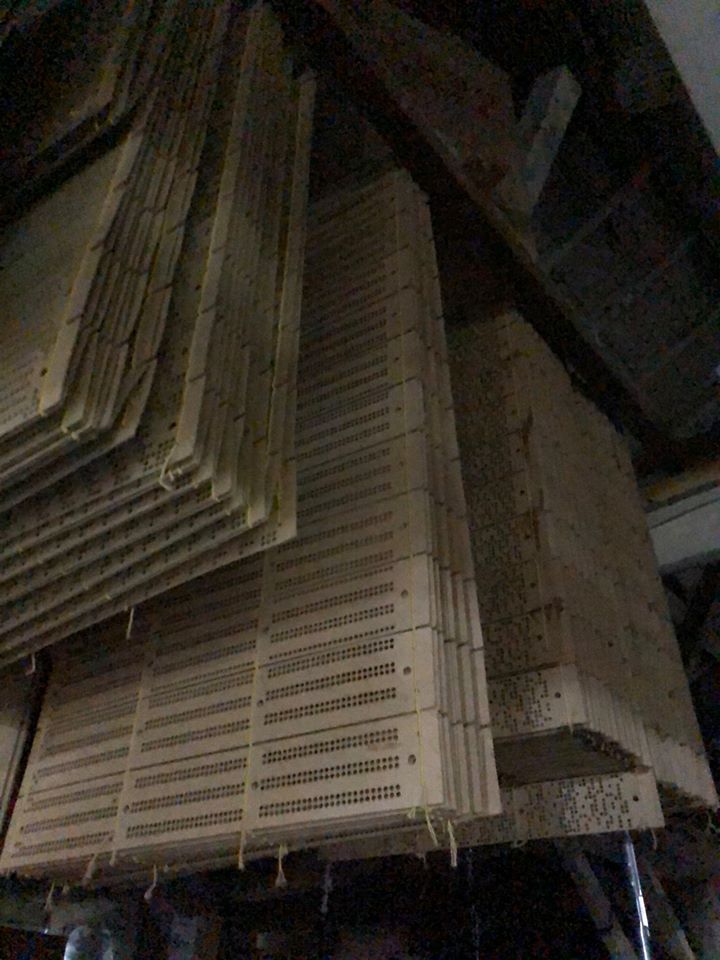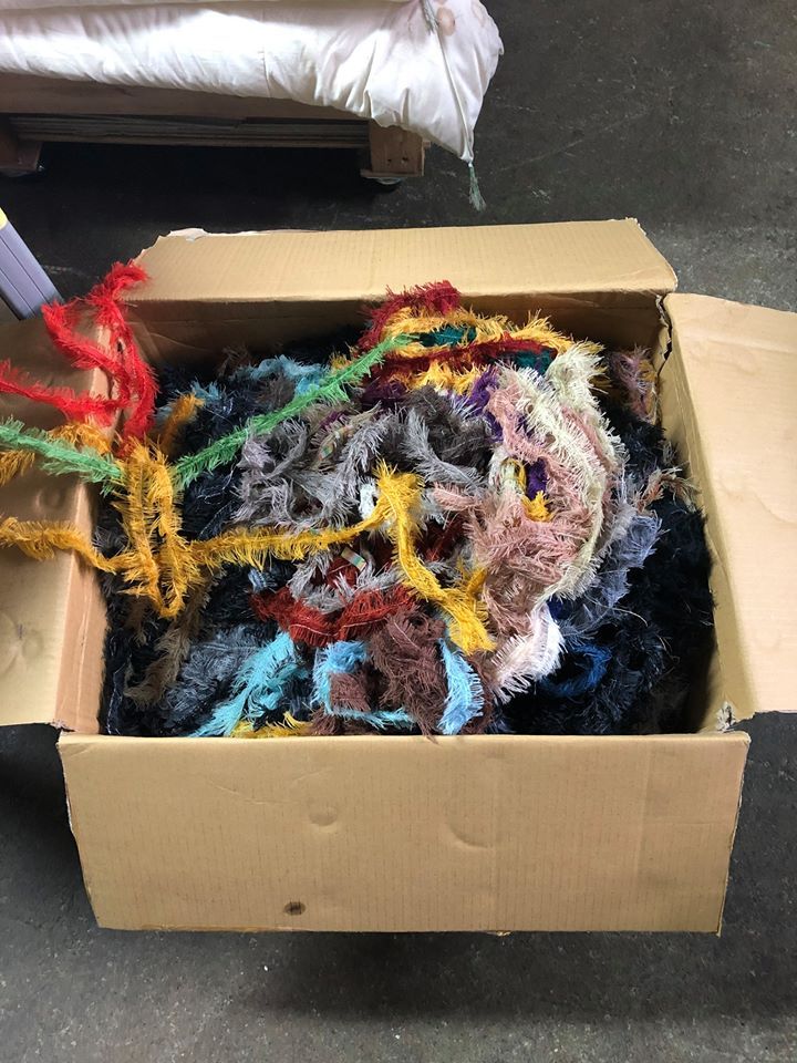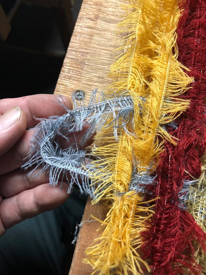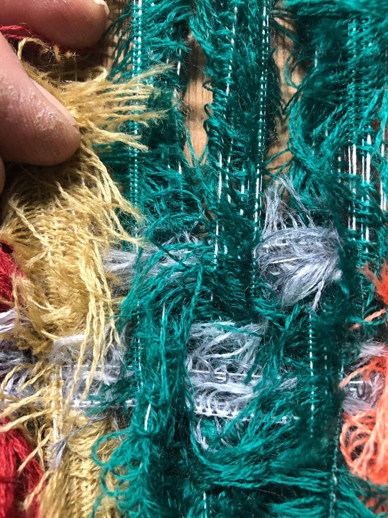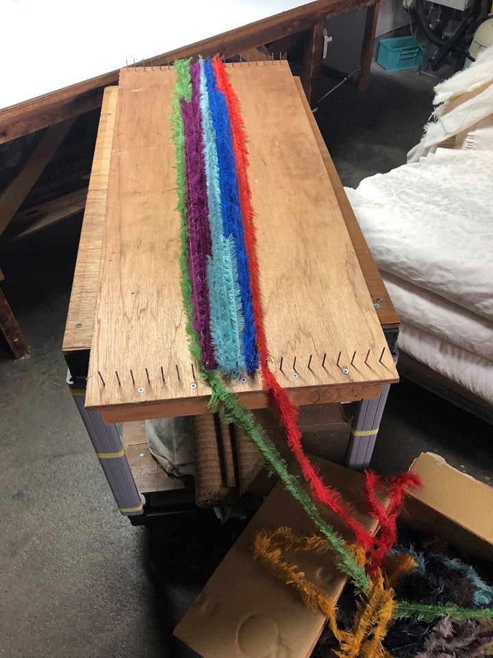 完成した「手織り機」?のフックに房耳をグルグル掛けていく