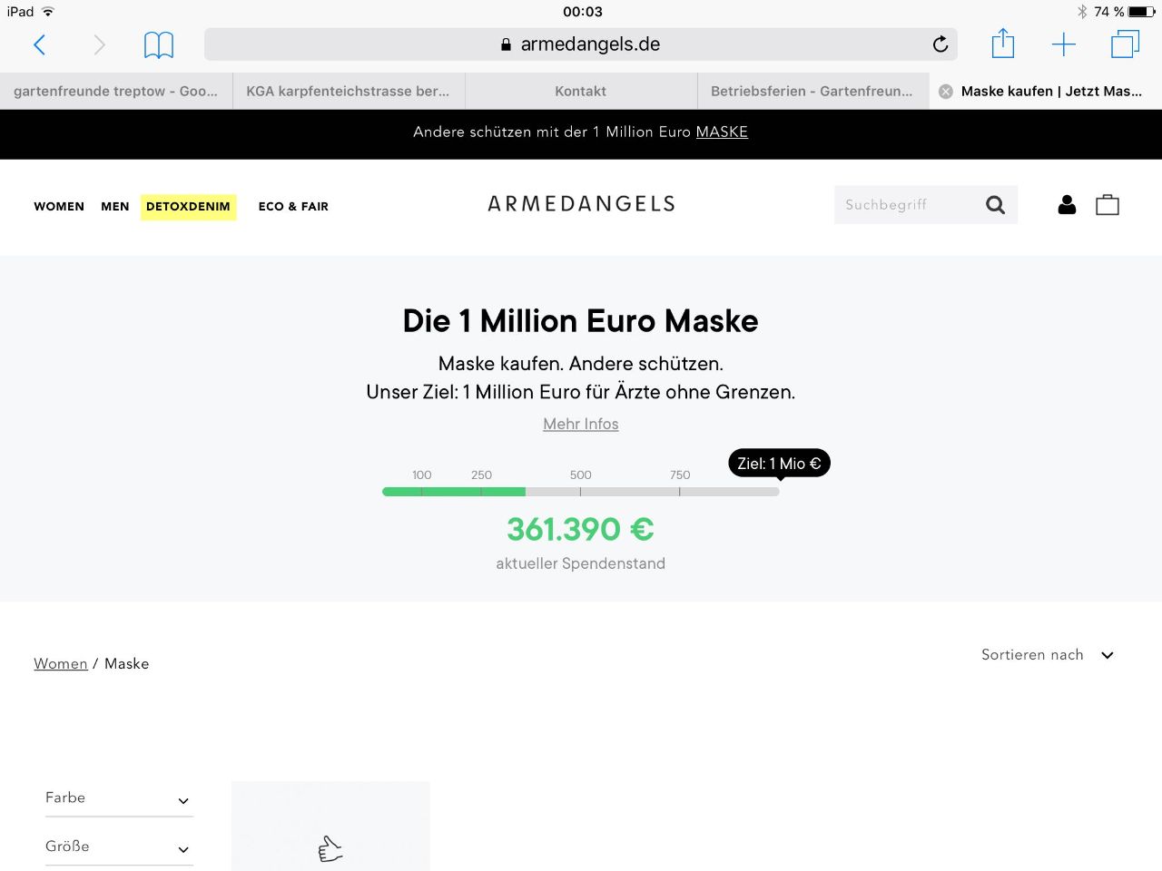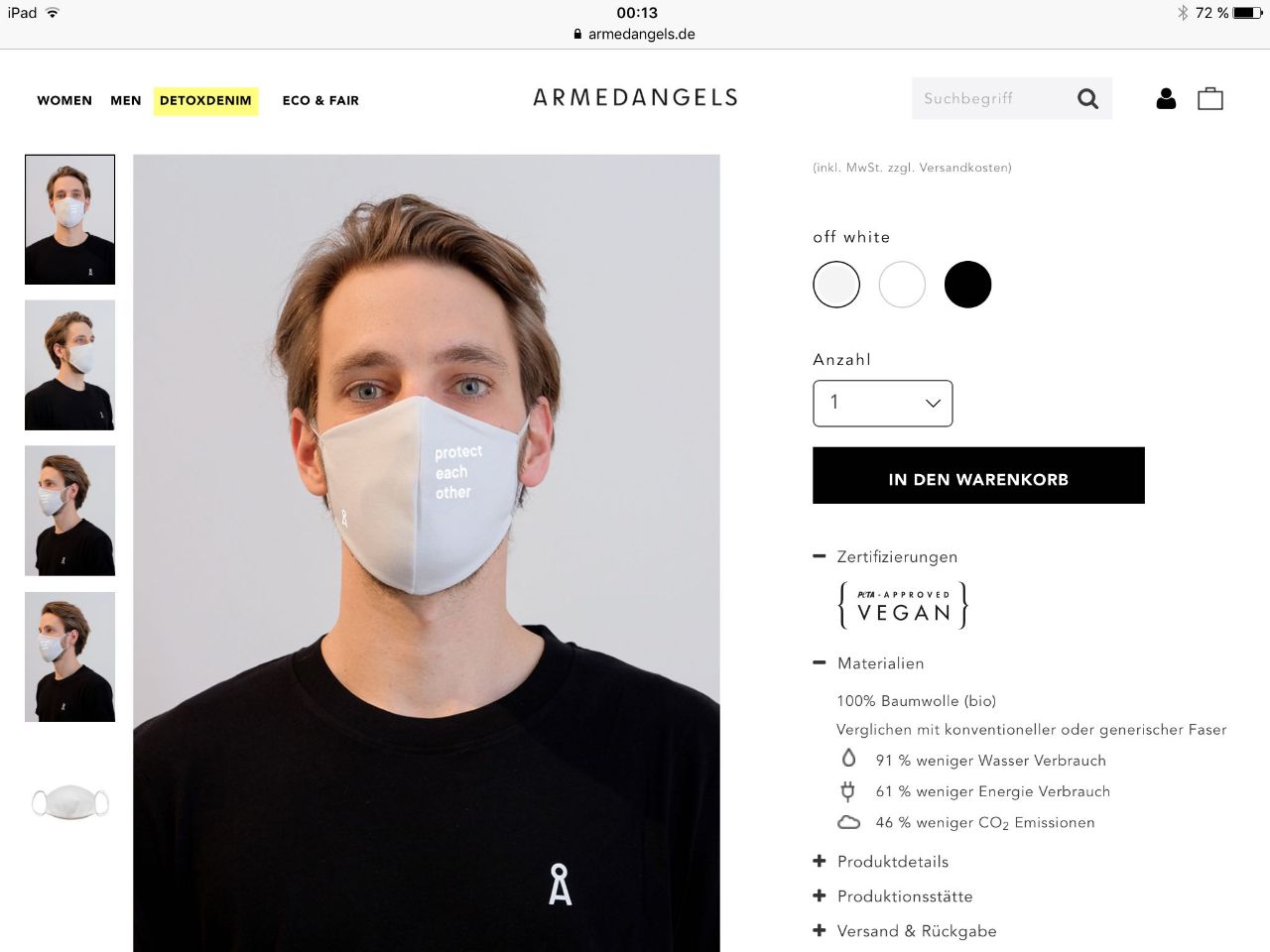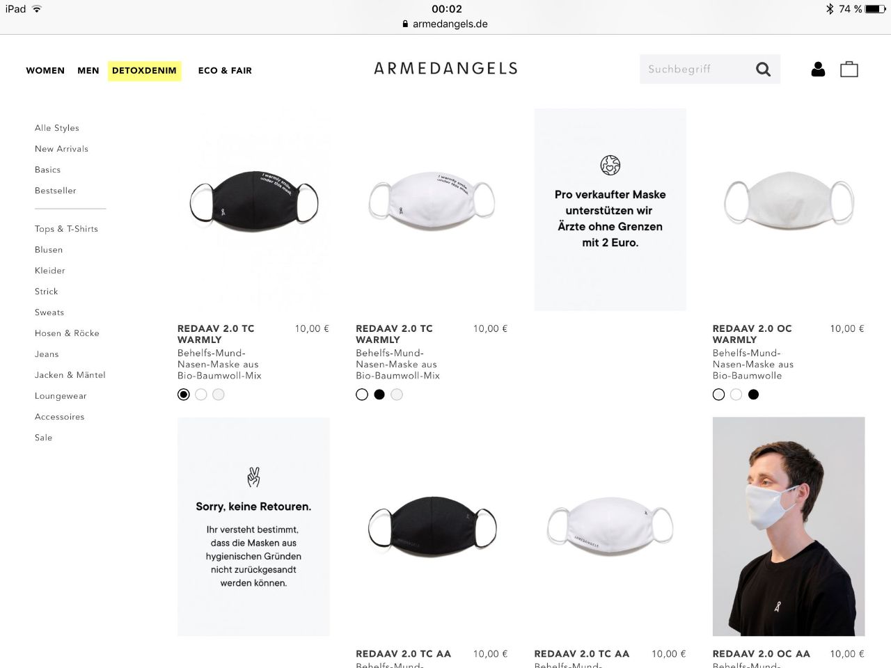 このメーカーではマスク一枚購入すると2割に当たる2€を国境のない医師団に寄付するシステムにしている。