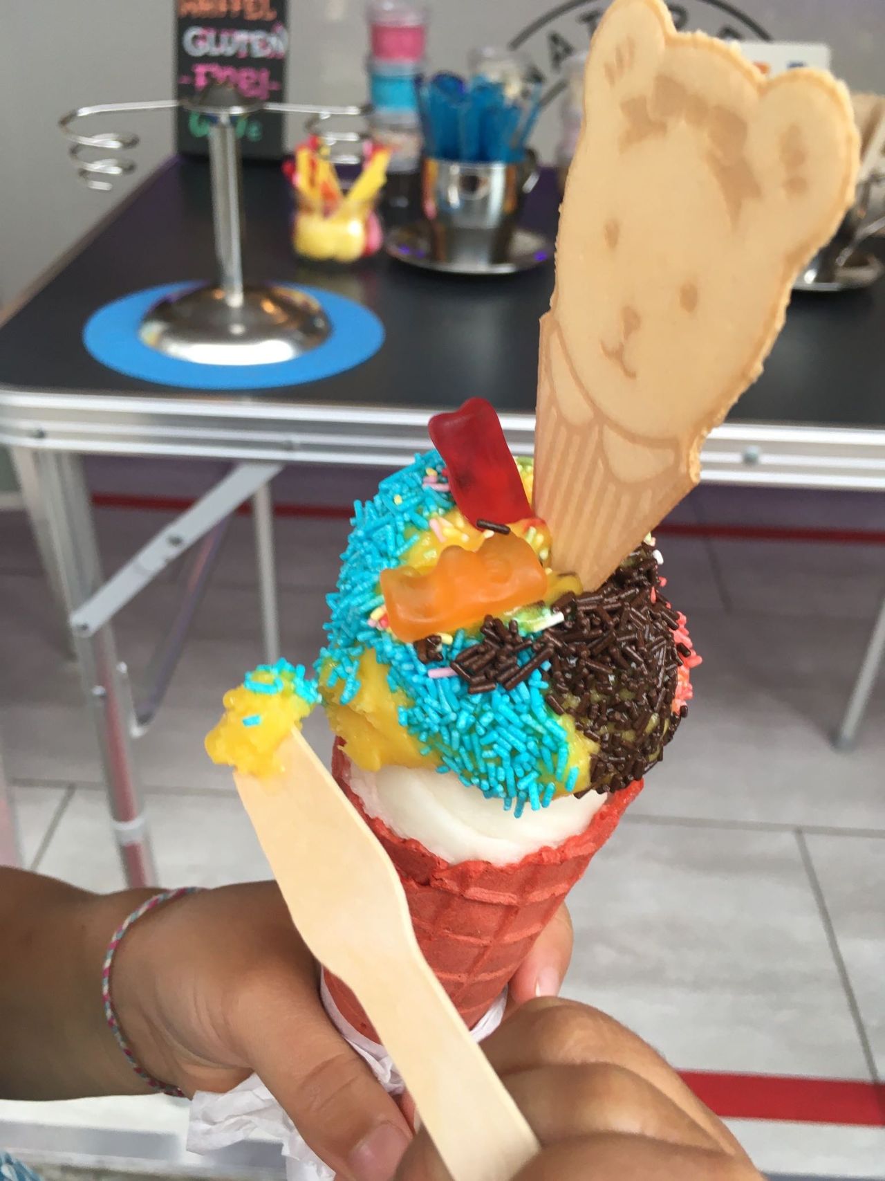 子供心をくすぐるトッピングも満載。娘は常連客なので(笑) トッピングも自分でお願いしているのですが気がつくとこんなてんこ盛りに(笑)