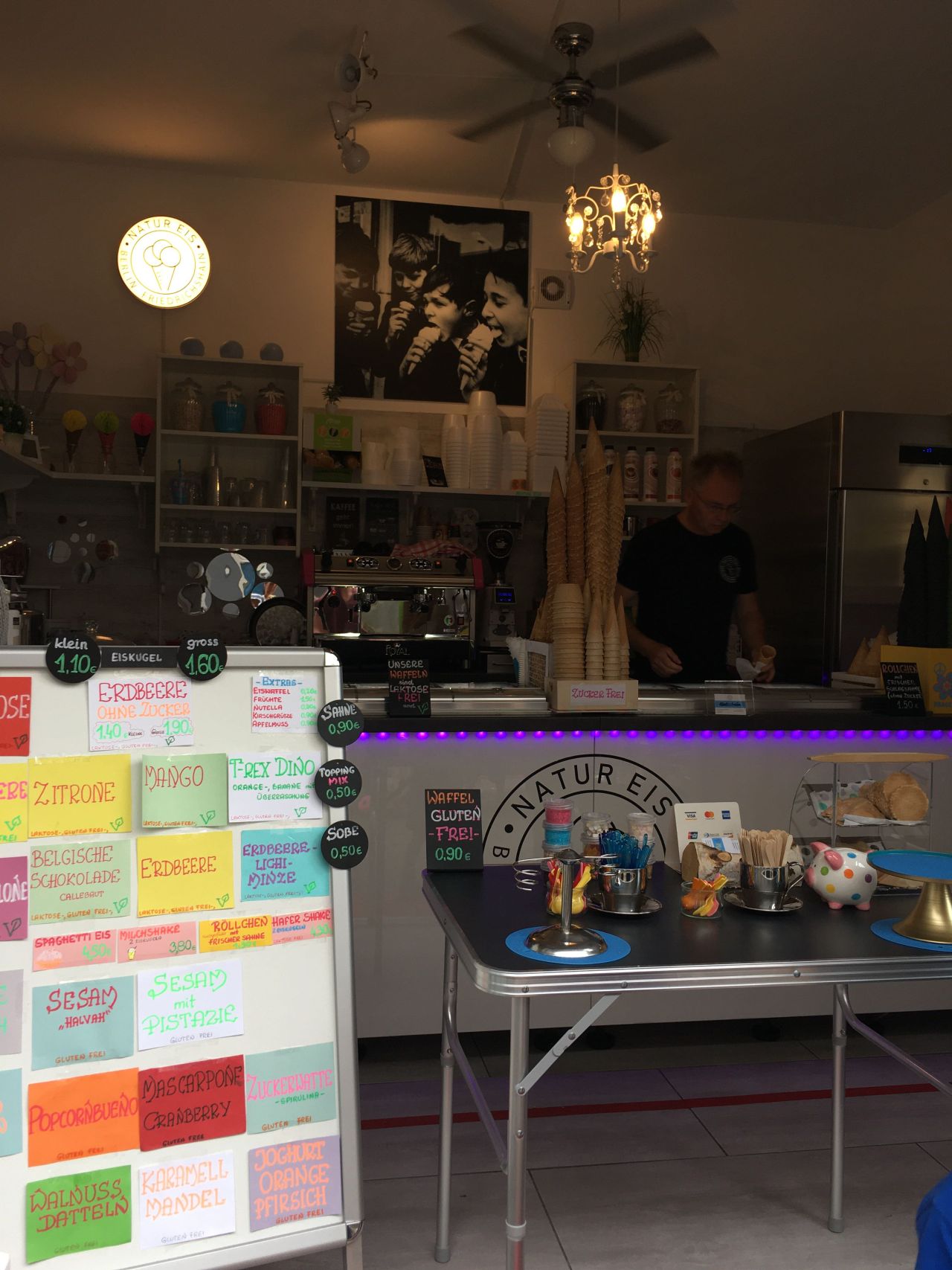 小さな店内はオーダー専用。手書きのメニューを見て注文します。アイス一つ1.10€。みんな3つくらいワッフルコーンに乗せてもらっています。