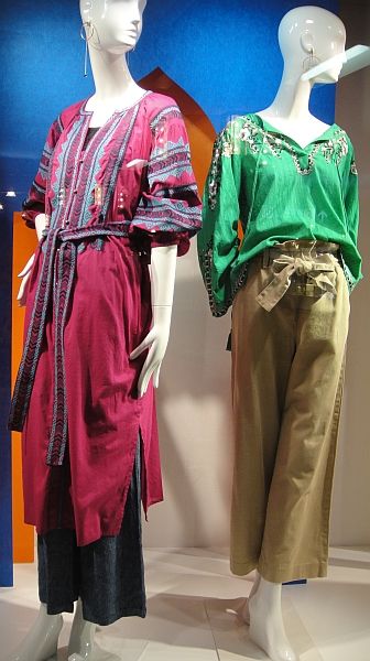 どこの国と特定は難しいのですが、砂漠を思わせたり、サリーのような肩に掛けたり被ったりするもの、祭りの衣装、刺繍やリボンワークなど技巧を凝らしたものも見られます。