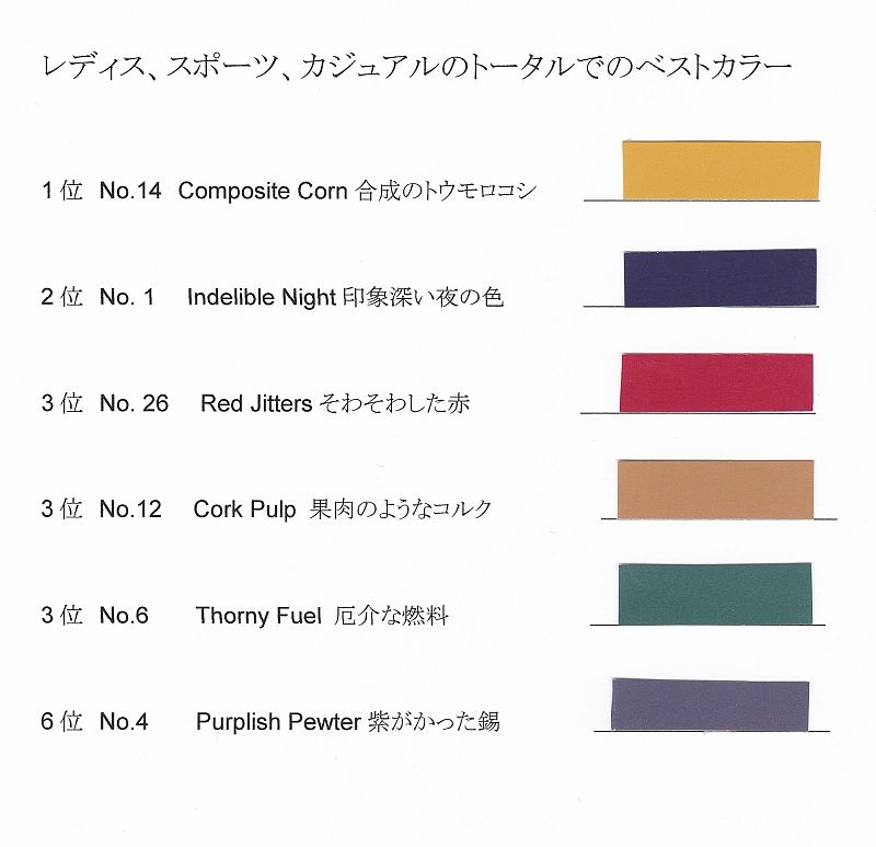 1位は両方で2位であったNo.14、 2位はNo.26とNo.12で、ピンクやコルクの色など暖かさのある色が選ばれました。