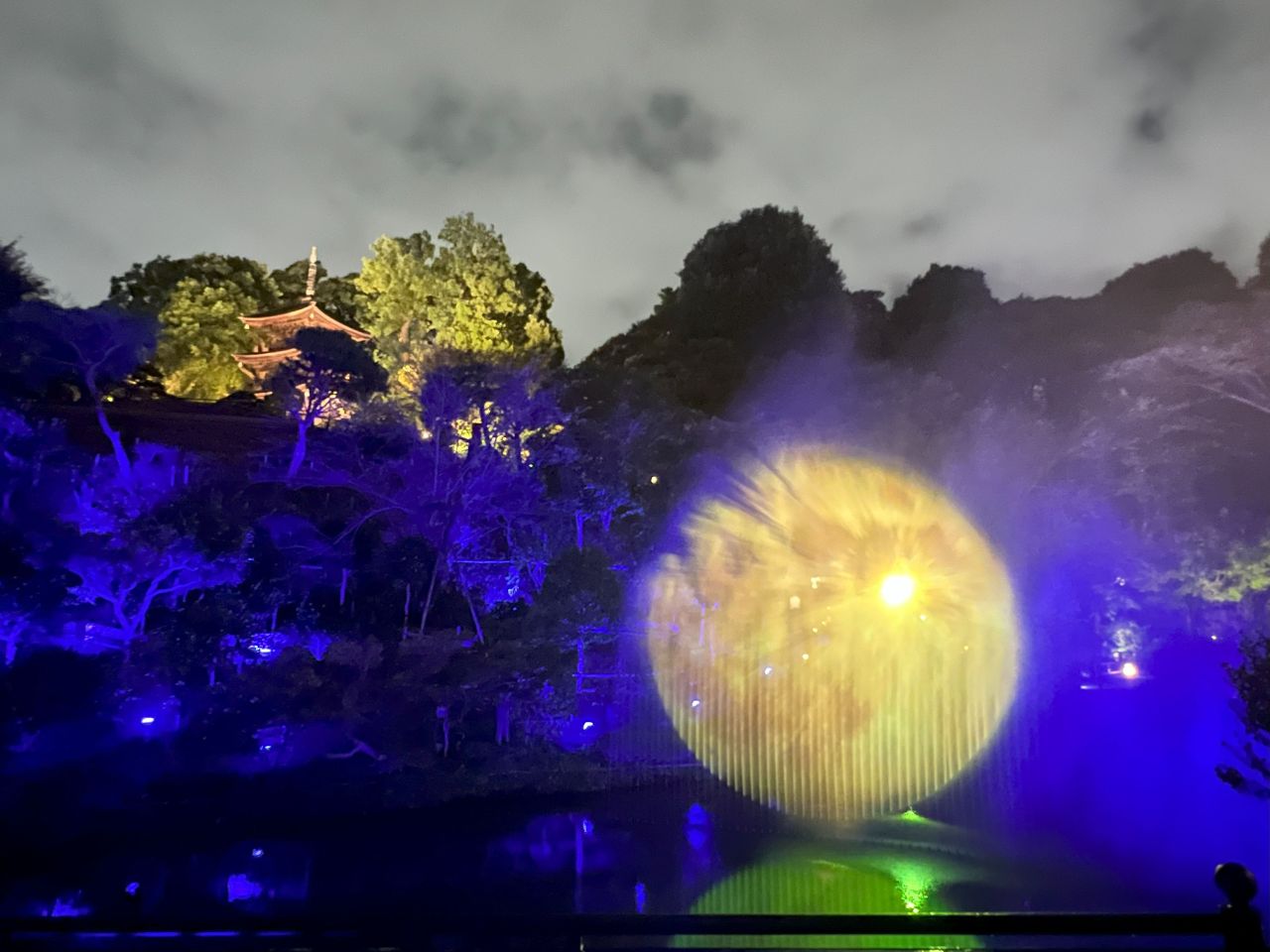 今年は三重塔が東京に移築されてから100年という記念の年。これを祝して、約7分間の演出の中で月が満ち欠けし、最後にはスーパームーンが姿を現すという新しい仕掛けが加わった。池の向こうに浮かぶ月、その奥にそびえるライトアップされた三重塔。その風景は、まるで時間が止まったかのように観る人の心を奪う。
