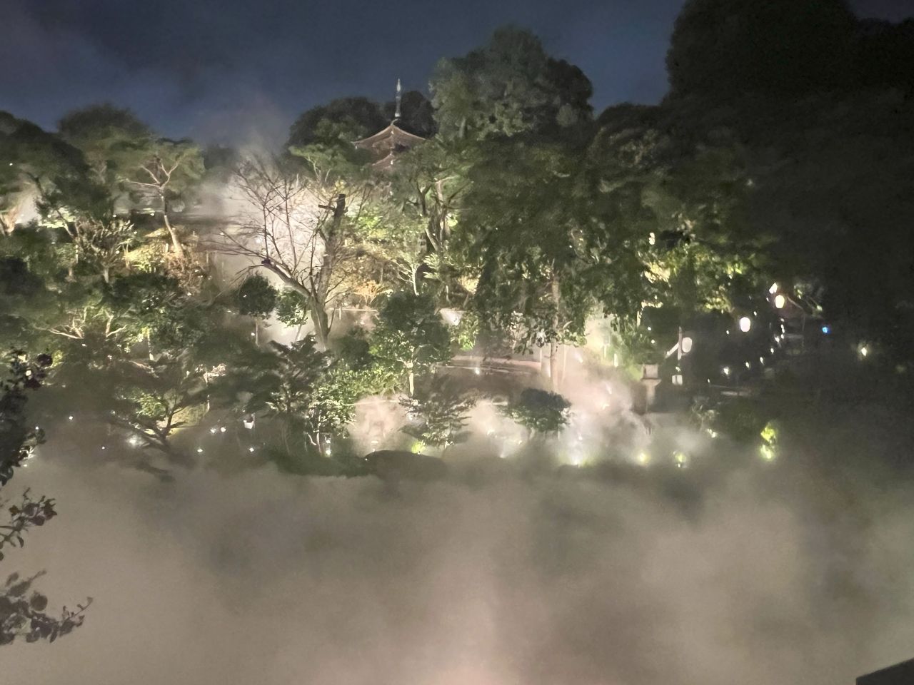 一方、秋の夜をさらに幻想的に演出するのが「TOKYO MOON ~雲と百年の月あかり~」。幽翠池に霧を噴き上げ、その水面に「雲海スクリーン」を作り出し、そこへ月の映像を映す人気演出だ。