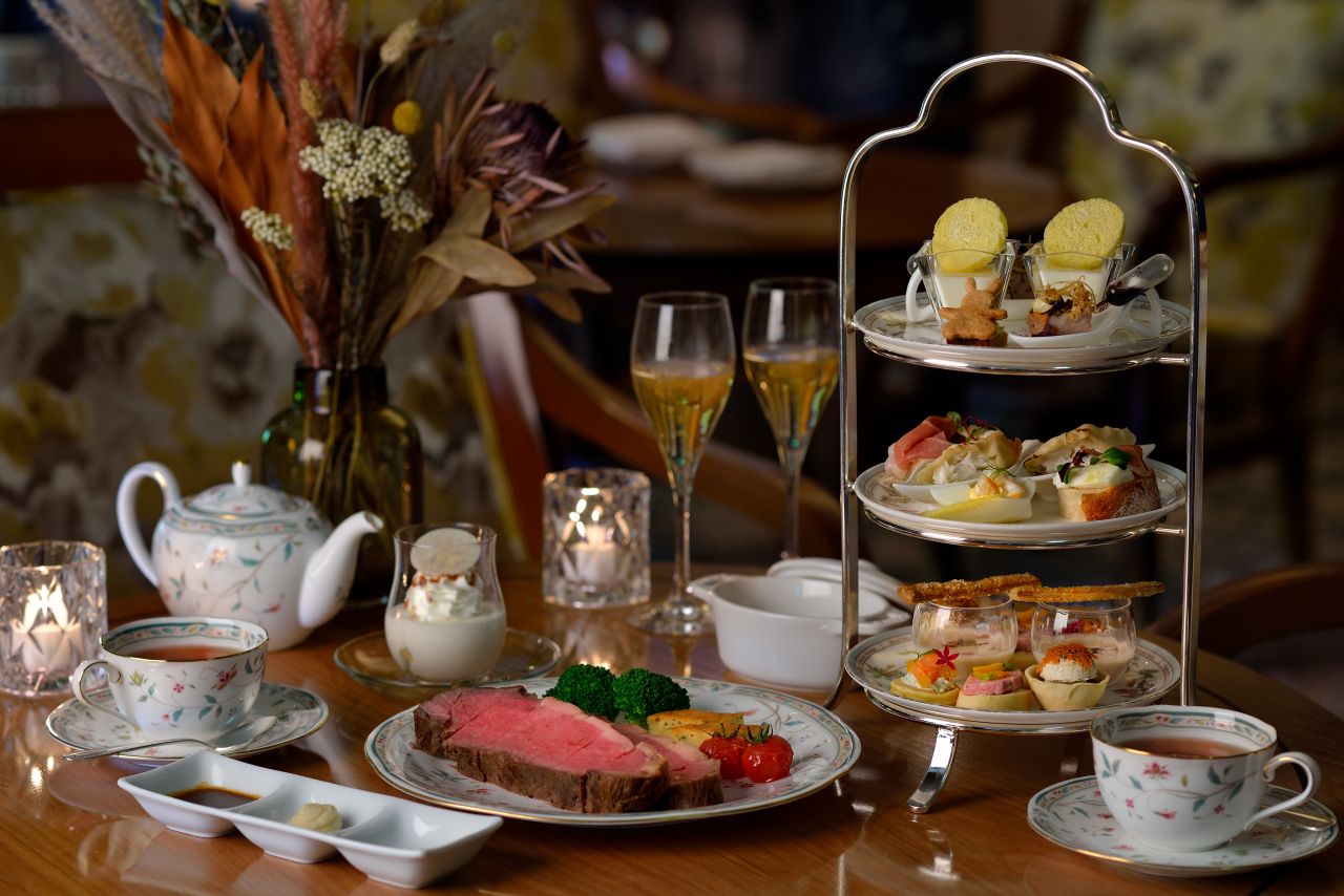 お月見イブニングハイティーでは、三段のオードブルスタンドとシェフ特製のローストビーフ、さらにうさぎのクッキーや柿を使ったパンケーキなど、秋の味覚が満載。