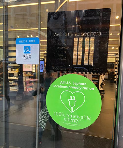 ステッカーには、全ての米国内のセフォラの店舗では、100%リサイクルエネルギーを使用しているとのことです。