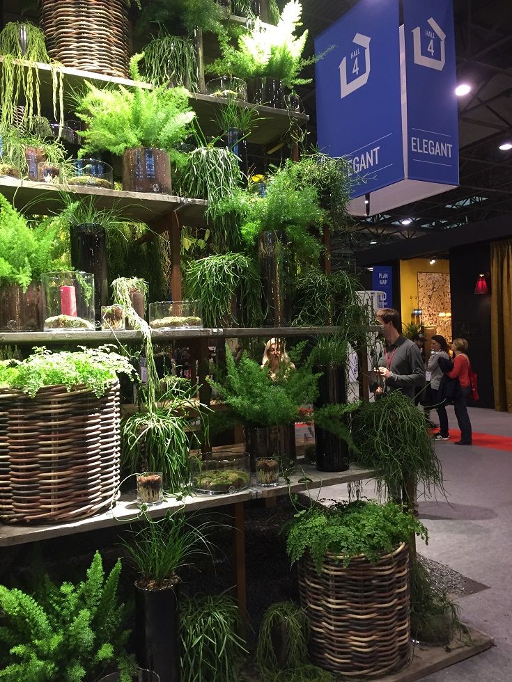今回気になったのは、藤や柳、竹といったカゴ素材を使ったランプシェイドや植木鉢カバー。大きな見本市会場の天井には、カゴのシェイドが下がっていた。