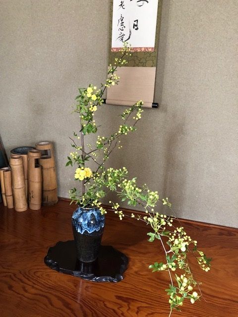 床の間には、モッコウバラの枝。私が大好きなのを知り、友人が持ってきてくれた。