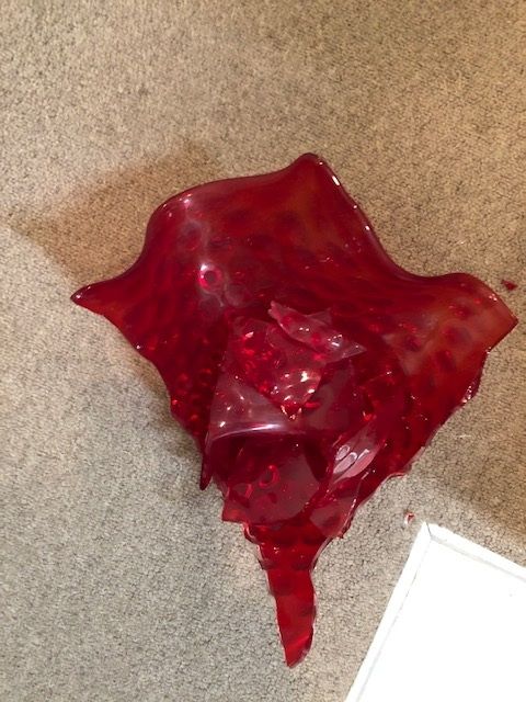 湯呑み(熊本で購入した渋い小代焼き。ちょっといびつな形が気に入っていた)と、ガラスの大きな器(縁が波打った形の60年代風の赤いガラス。花器のようだが、私は物入れに使っていた。10数年前に古道具屋で購入)。持ち上げて移動しようとしたときに、うっかり硬いものにぶつけてしまったのだ。