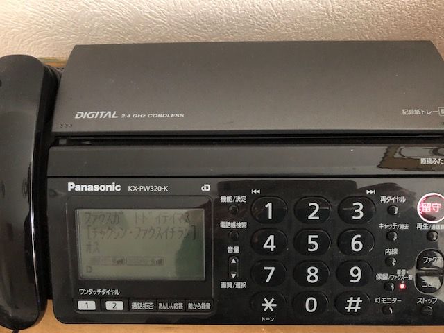 我が家はこんな電話機が2台並んでいる。ファックスは送信はできるが、インクリボンが高いので買い替えずに受信できないようにしている。悪しからず。